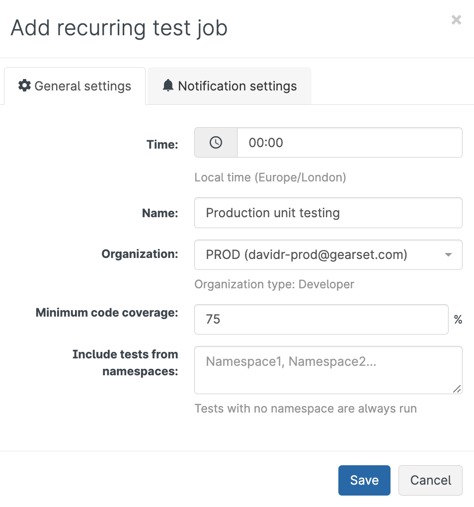 - Choose the time of day your unit tests will run, name the unit testing job, and select the org you want to set up the job for. You can also set your own code coverage target if you want to aim higher than 75%. Finally, you can include tests from namespaces by listing them.