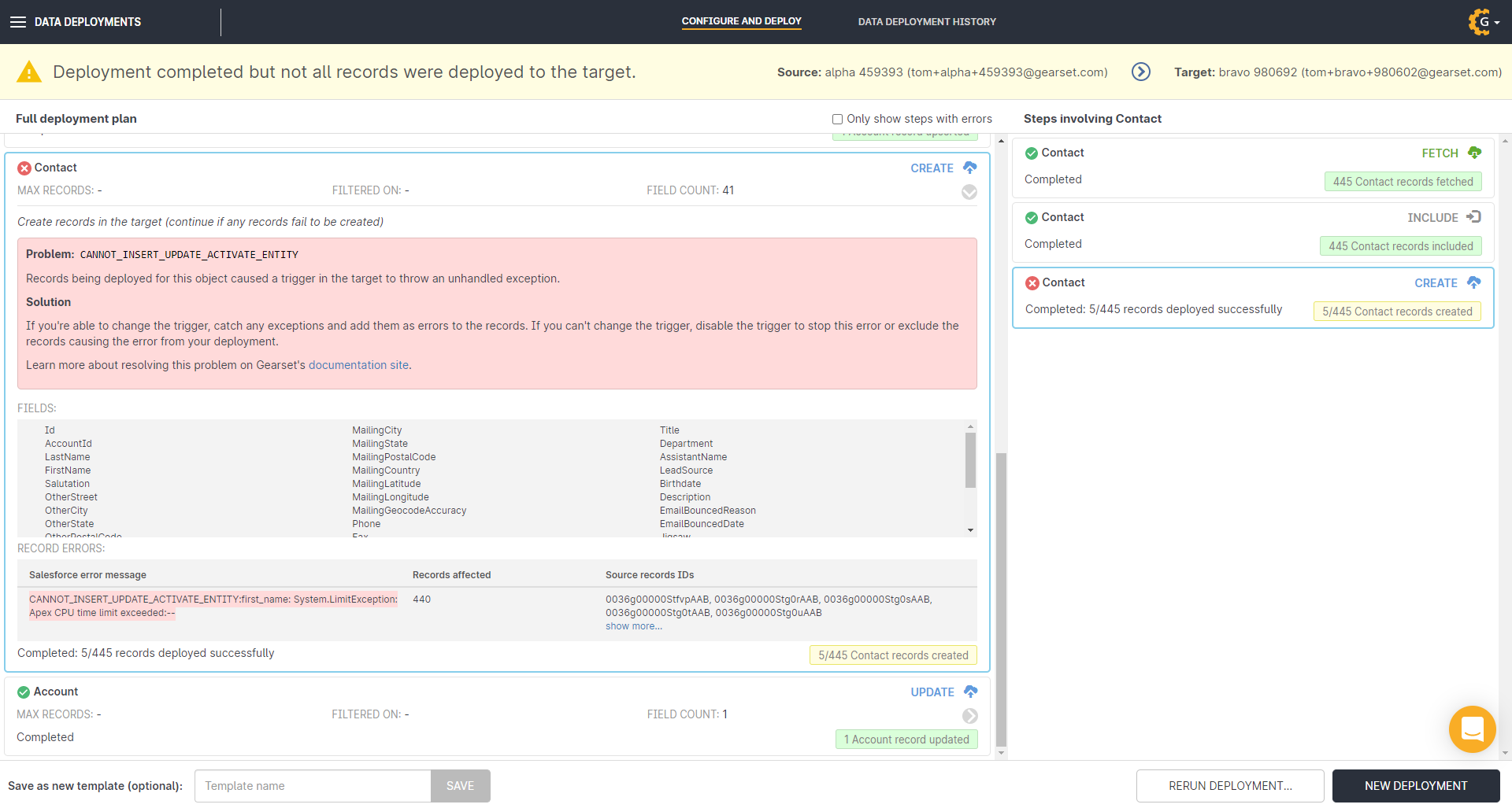 For example, you might have a straightforward data deployment of Contacts. But the target object has triggers that all fire and attempt to run multiple processes when you deploy. If any of these processes reaches the CPU limit, this prevents the Contact record from being deployed. Salesforce will report this error message: Apex CPU time limit exceeded.