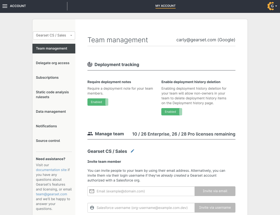 Team management in Gearset is based on team owner and team member roles. Every team has at least one team owner, who can name the team, set roles and add or remove team members. Team owners can assign licenses to team members and view the particular subscriptions of each member along with the invoice history, making it easy to monitor and manage team members as your team changes and grows.