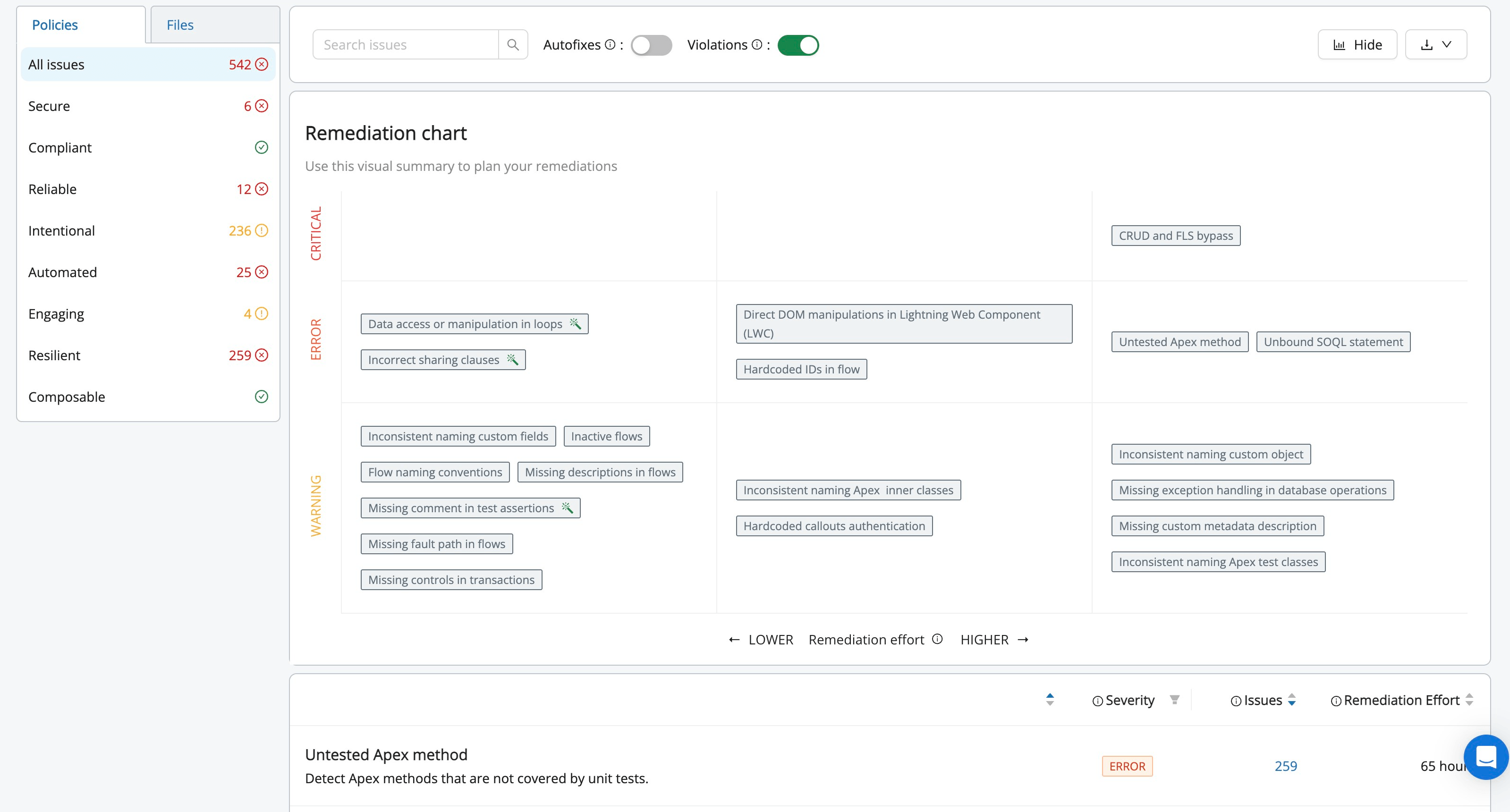The Remediation Chart makes this visible: issues are grouped by rules, plotted by severity and fix time, and surfaced in Git branch reviews or org assessments. That visualization helps teams quickly identify “quick win” fixes versus long-term remediation projects — a practical input into a Technical Debt Registry or Technical Debt Ratio calculation.