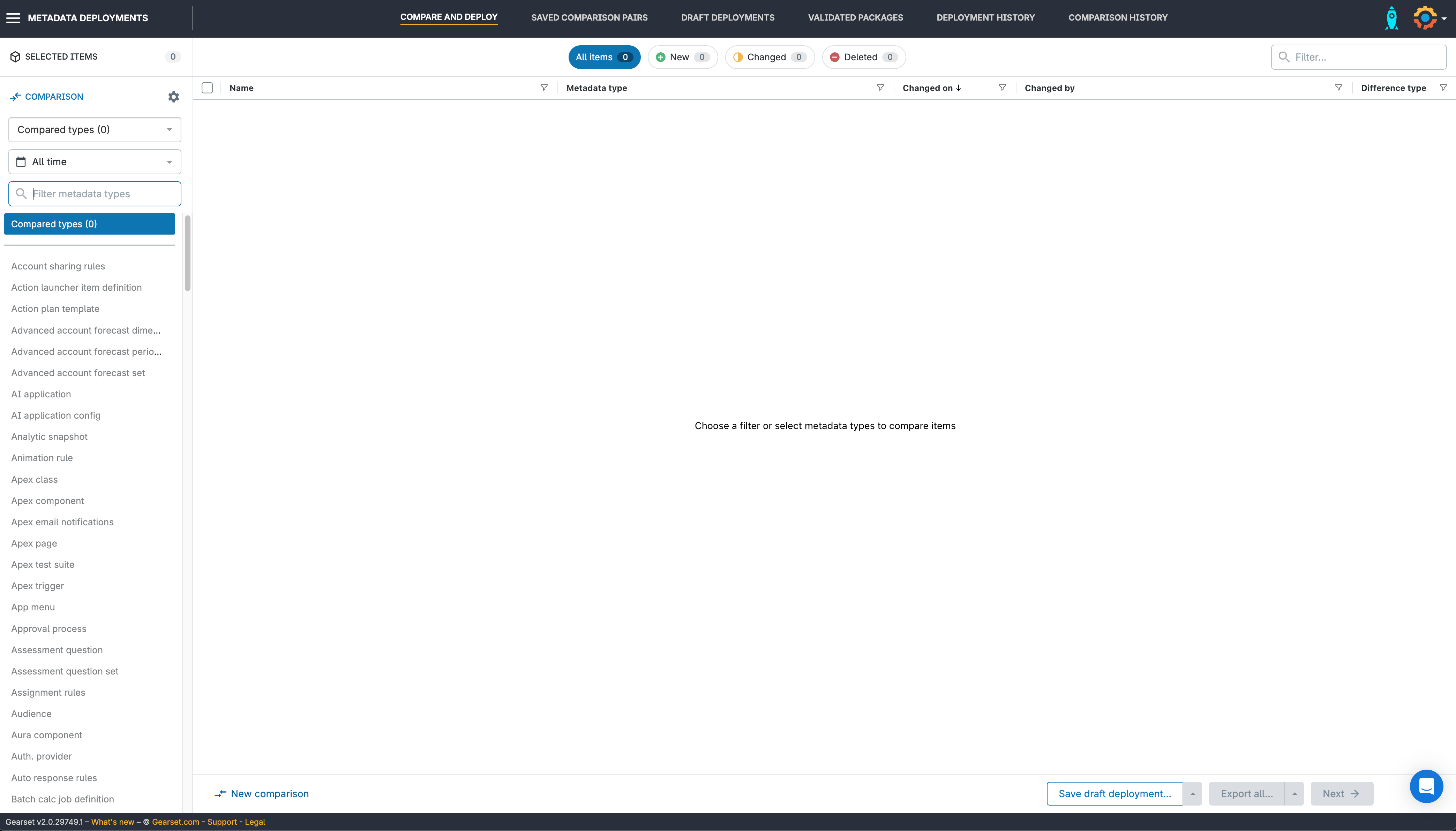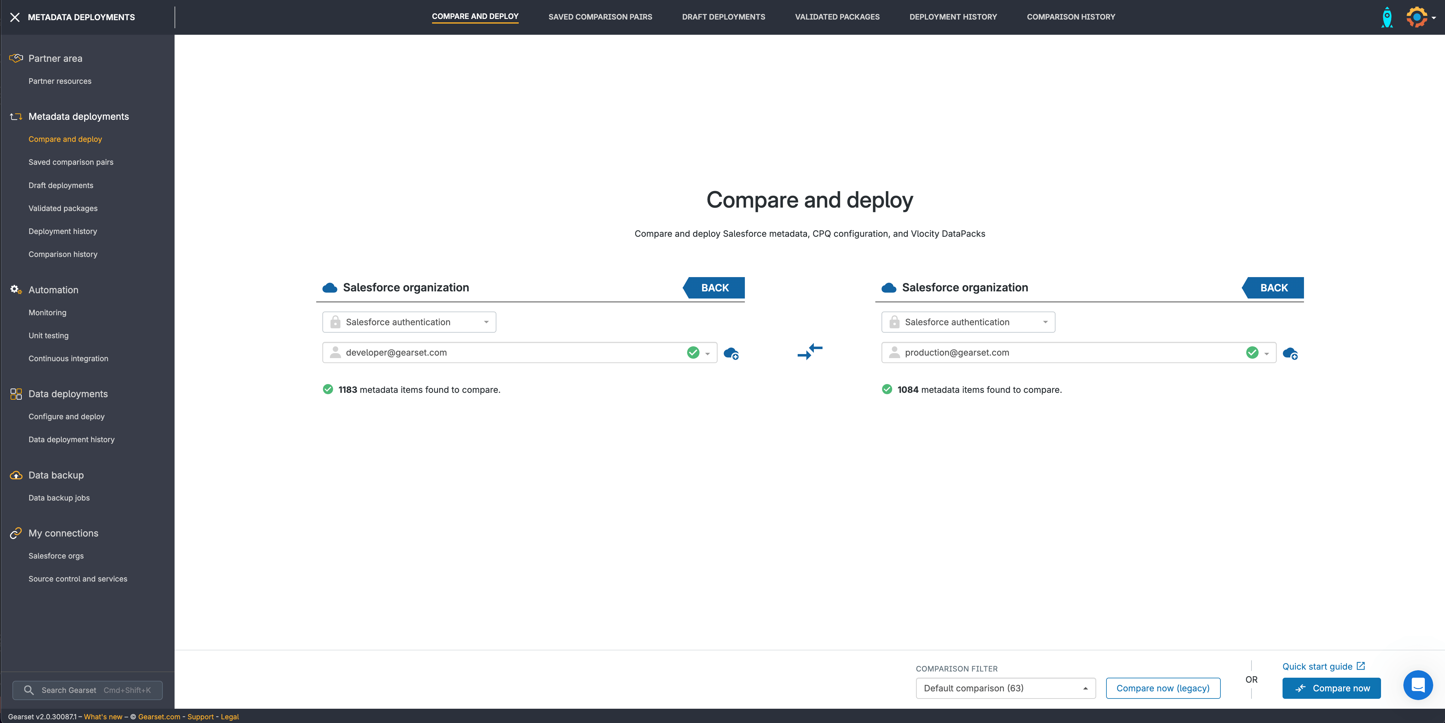 • Faster comparisons of your orgs. No more loading screens when running your comparison. Instead you’ll be taken straight to your comparison results and see them update in real time, significantly speeding up the whole comparison process.