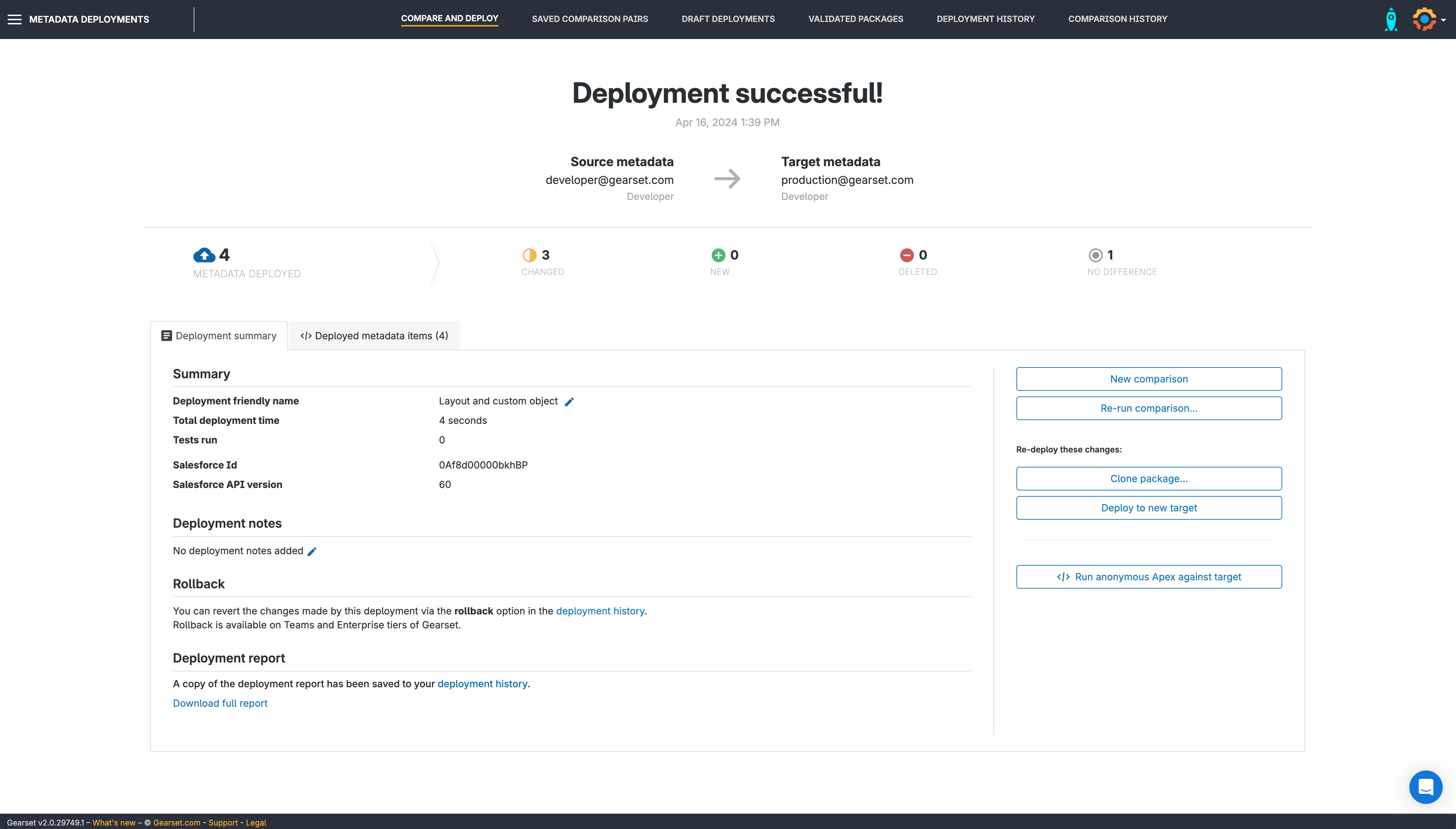 After the deployment has run, we get a summary of the deployment and can download a full report at any time from the Deployment history page. If we need to reverse the changes later for whatever reason, we can roll back the deployment.