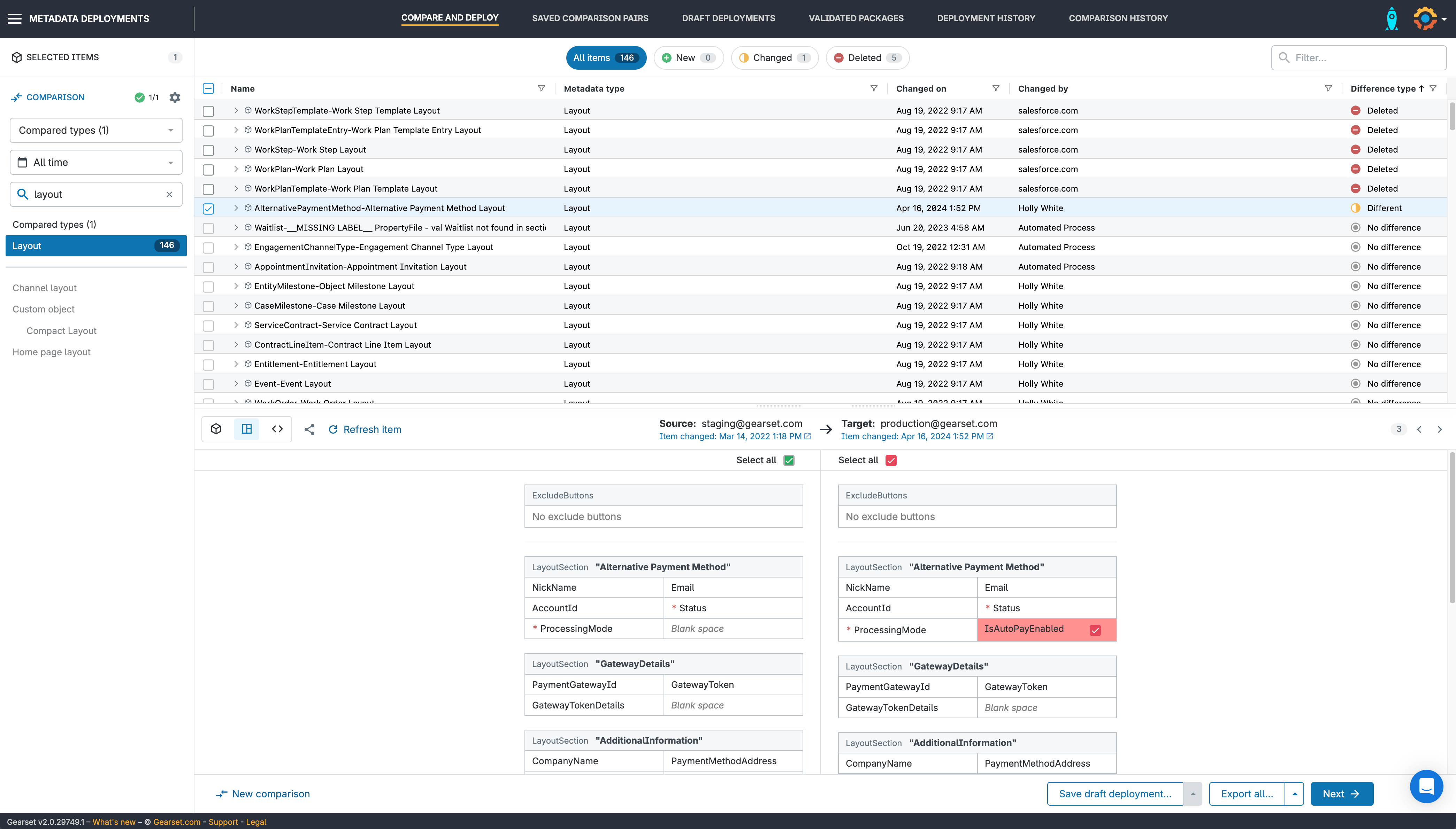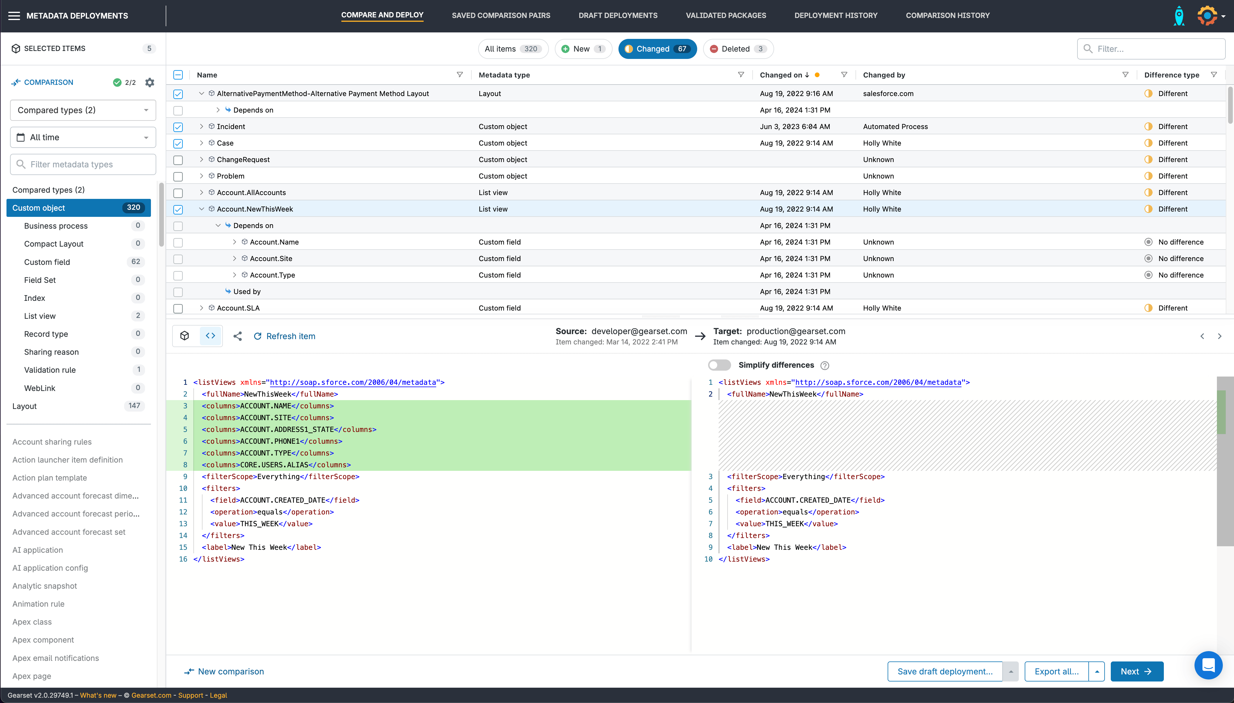 • See changes instantly. There’s no need to track every change in your orgs or sandbox because they’ll be highlighted as new, changed or deleted in Gearset’s UI. Because Gearset downloads and compares your metadata, instead of relying on Salesforce to flag changed metadata, you can be confident you’re seeing the most accurate changes in your orgs.