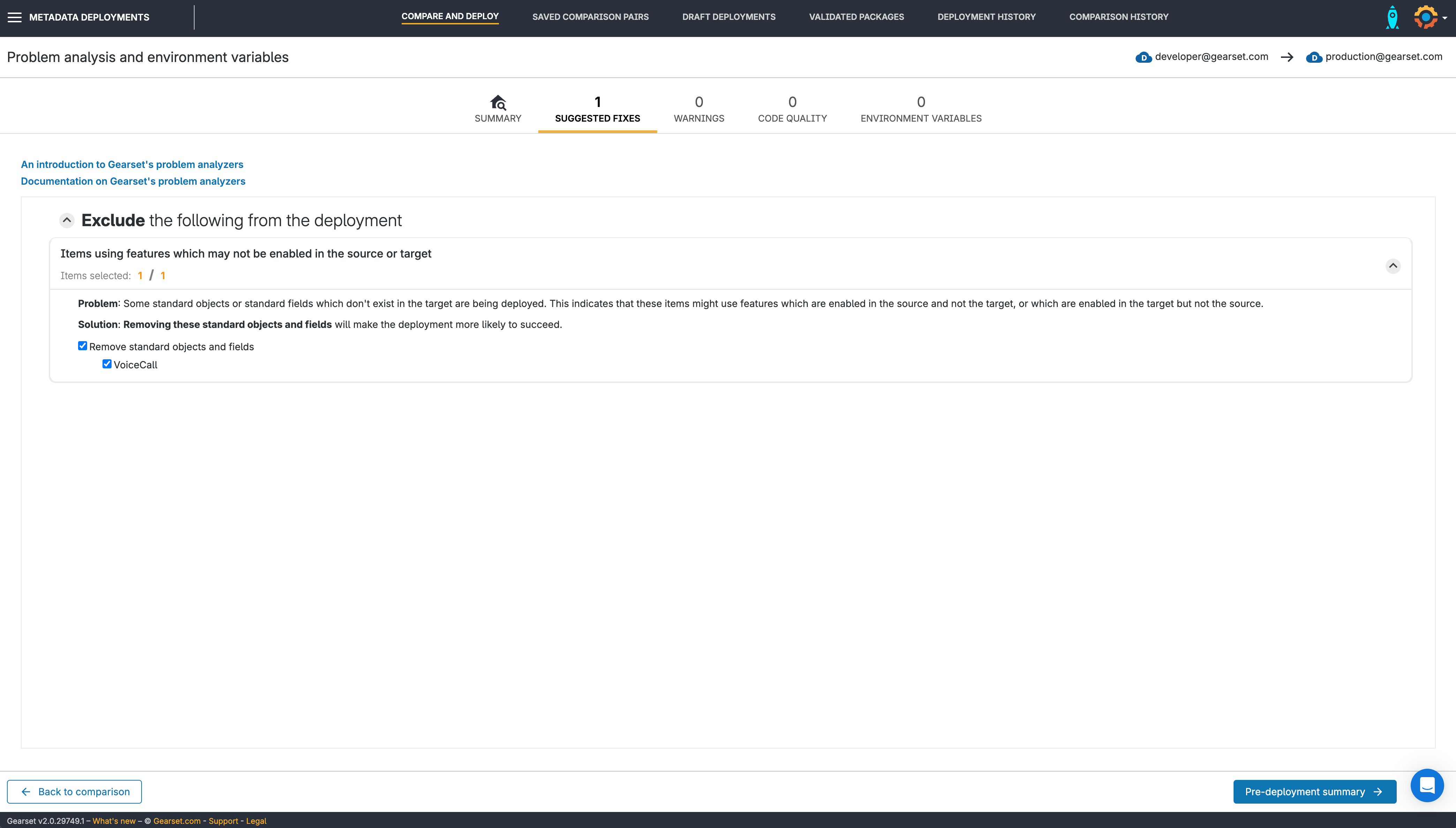• More than 100 problem analyzers. Once you’ve built a deployment package in Gearset, but before your deploy, Gearset’s problem analyzers will scan your selected components for any potential issues and automatically suggest fixes.
