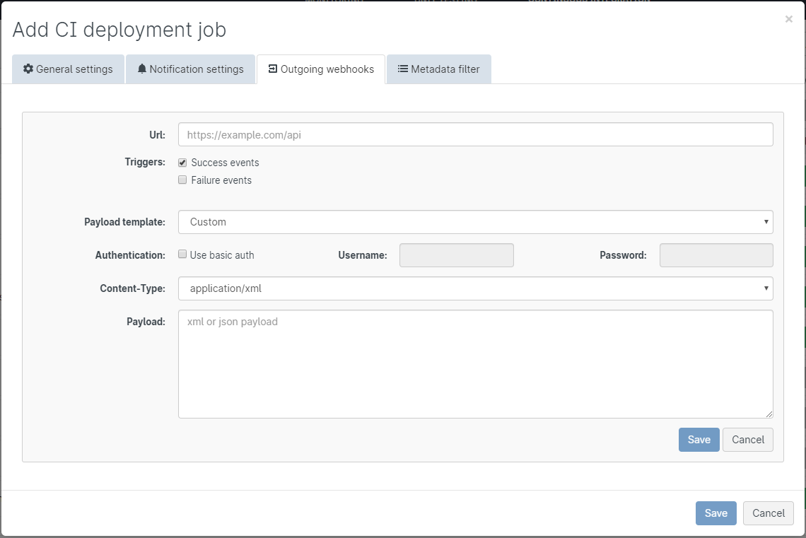 To create a CI job with an outgoing webhook, start by following the usual set up process There’s now an Outgoing webhooks tab where you can add the URL you’d like Gearset to post to. Choose which events you’d like to trigger a webhook and whether you’d like to use Basic Authentication in the post, then add the payload in either json or xml format.