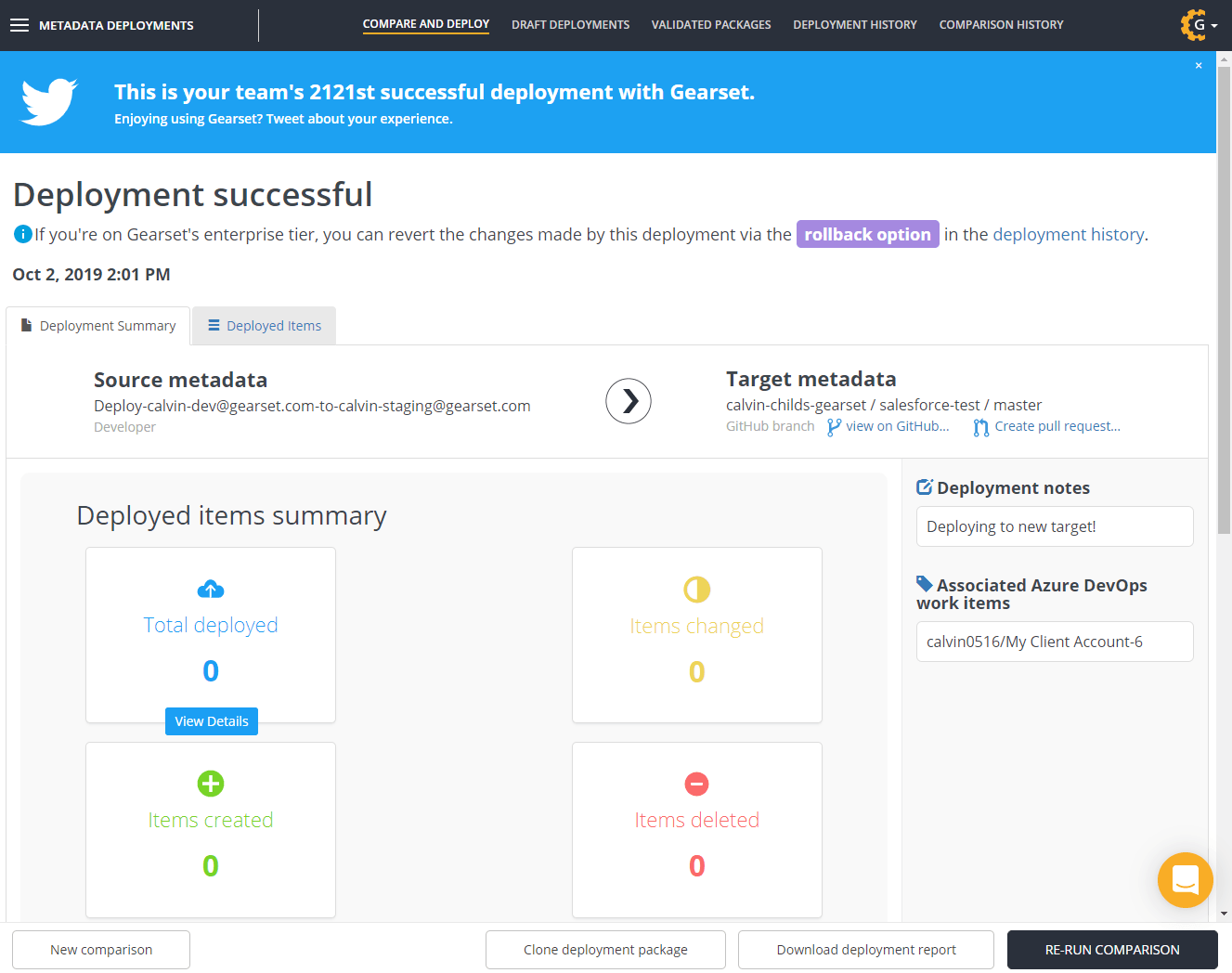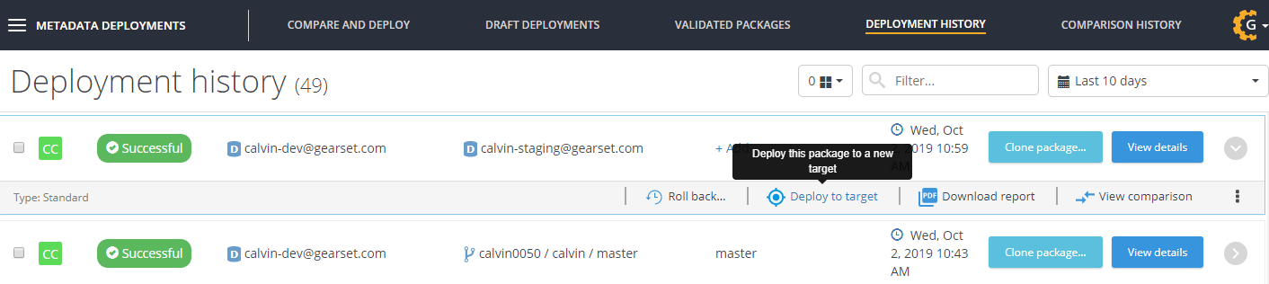 Gearset now lets you push the same changes to different environments quickly and consistently. Use this feature to redeploy any previous deployment to a new target, without repeating the comparison and analysis steps. This will save you time, as you no longer need to repeat actions to move the same sets of changes. Instead, Gearset runs the comparison in the background for you and copies your previous deployment settings.