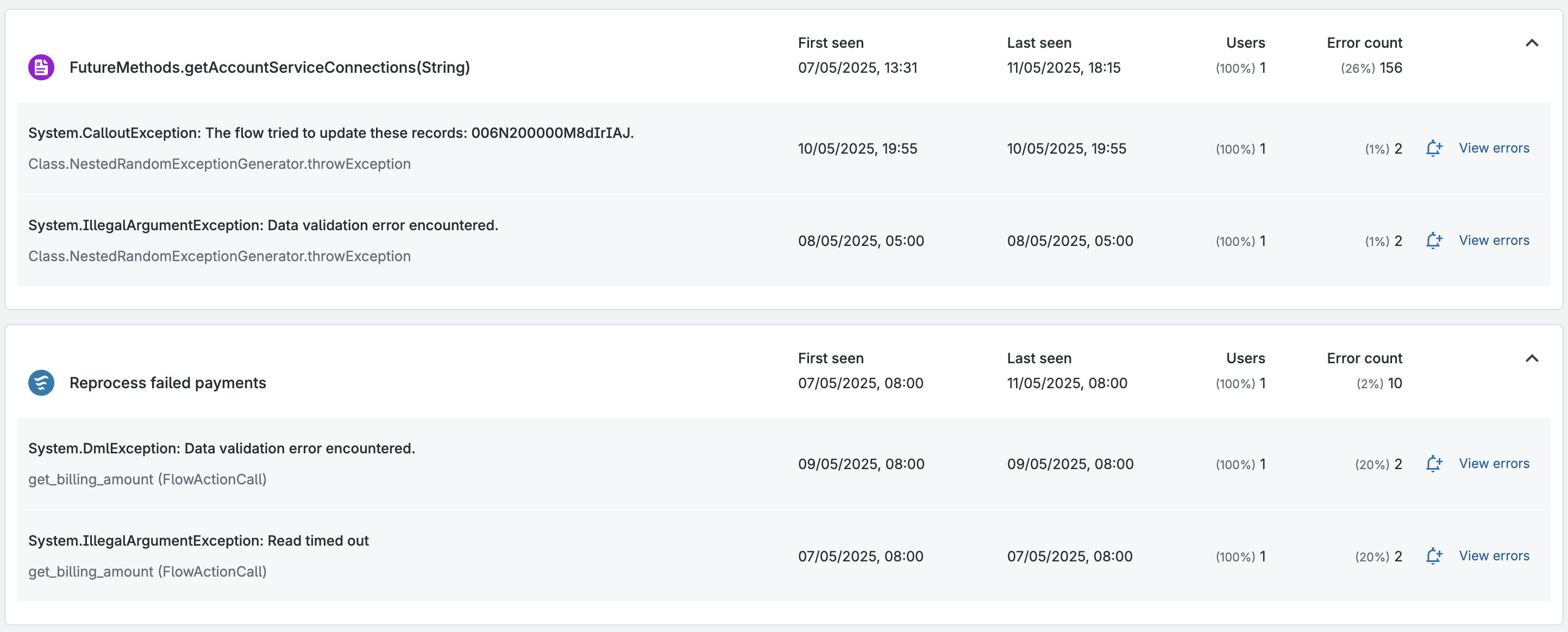 - Total number of impacted users and error counts across both Flows and Apex.