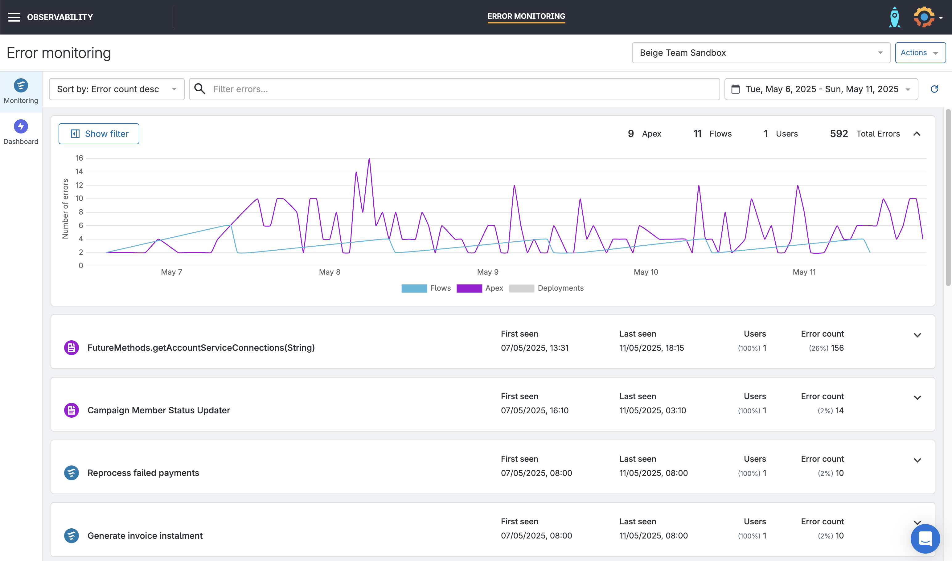 - View total error counts across all Flows and Apex, or drill down to individual errors when applying a specific Flow or Apex filter.