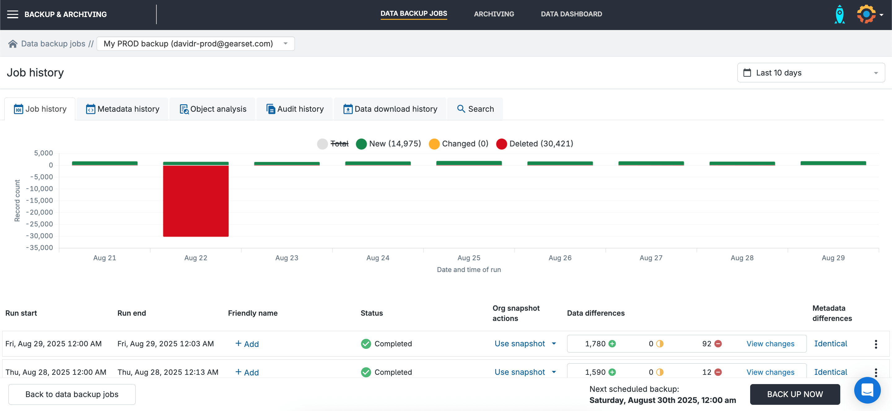 Gearset gives you full visibility into how your data changes over time. You can configure smart alerts to fire when thresholds are crossed that represent unusual data changes in your org. You’ll also get reports on metadata changes between each backup run.