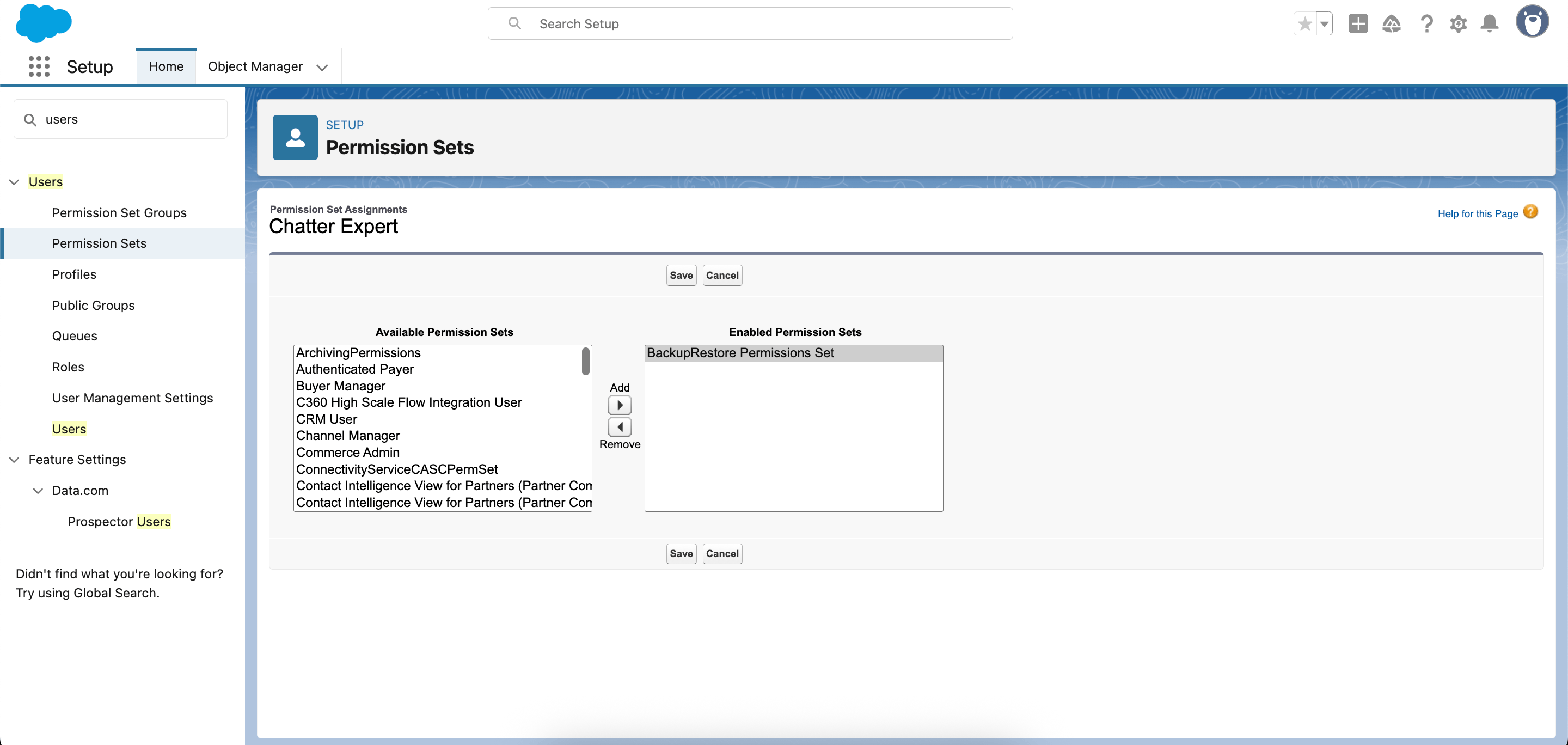 Users will also need the right permission sets. On the relevant user profile again, scroll down to the Permission Set Assignments section, and click Edit Assignments. Find the “BackupRestore” permission set, click Add, then Save.
