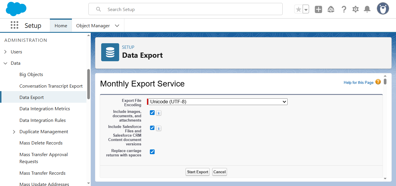 Click Start Export and wait for the email that notifies you that your organization’s data export has completed. Large jobs may take several hours.