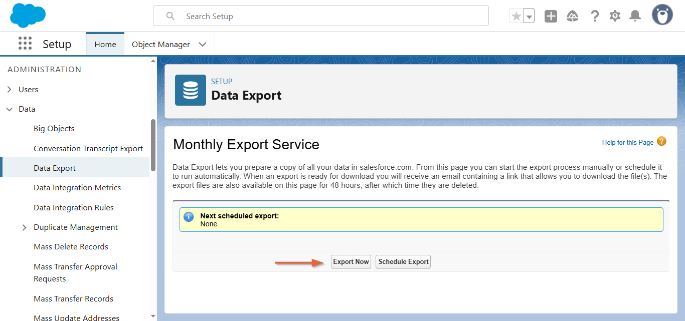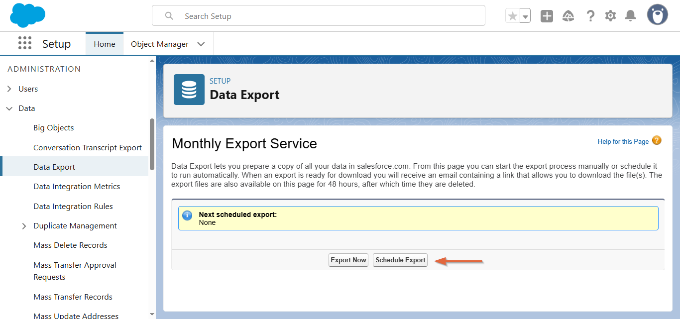 Salesforce’s Data Export Service creates CSV files containing the records from your Salesforce org, which are bundled into a ZIP archive for easy download. You can schedule these exports to occur on a weekly or monthly basis, depending on your Salesforce edition: