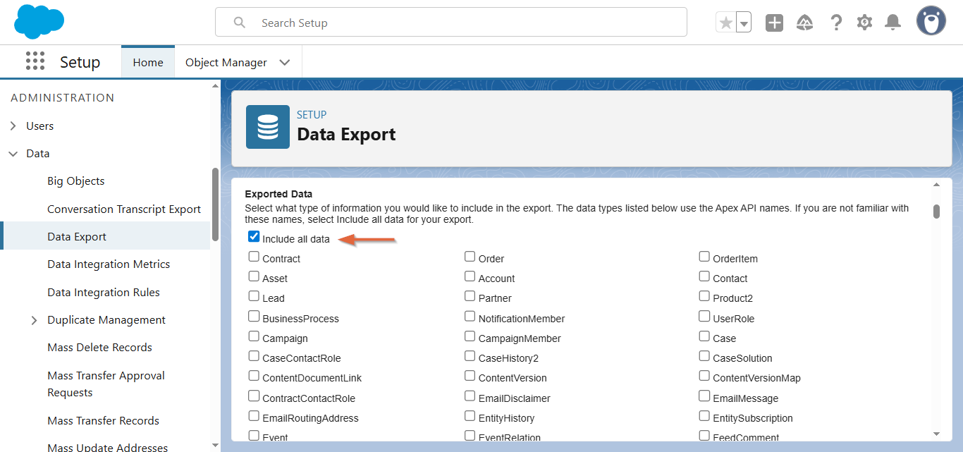 Scroll down and choose data scope. For this walkthrough, we’ll tick the Include all data box for a full org backup.