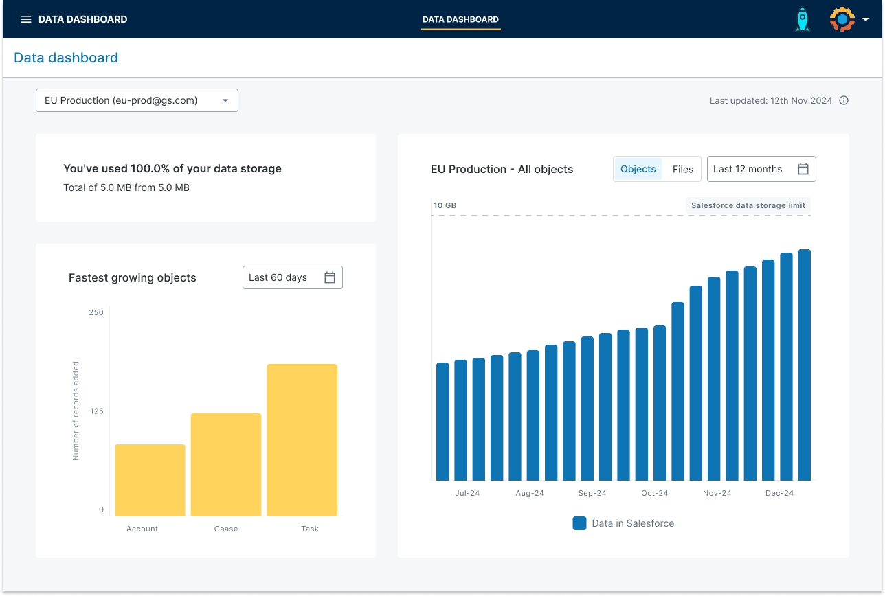 Go beyond a static view of storage with Gearset’s data dashboard. Available to backup customers, the data dashboard helps track storage trends, identify fast-growing objects, and catch unexpected data spikes.