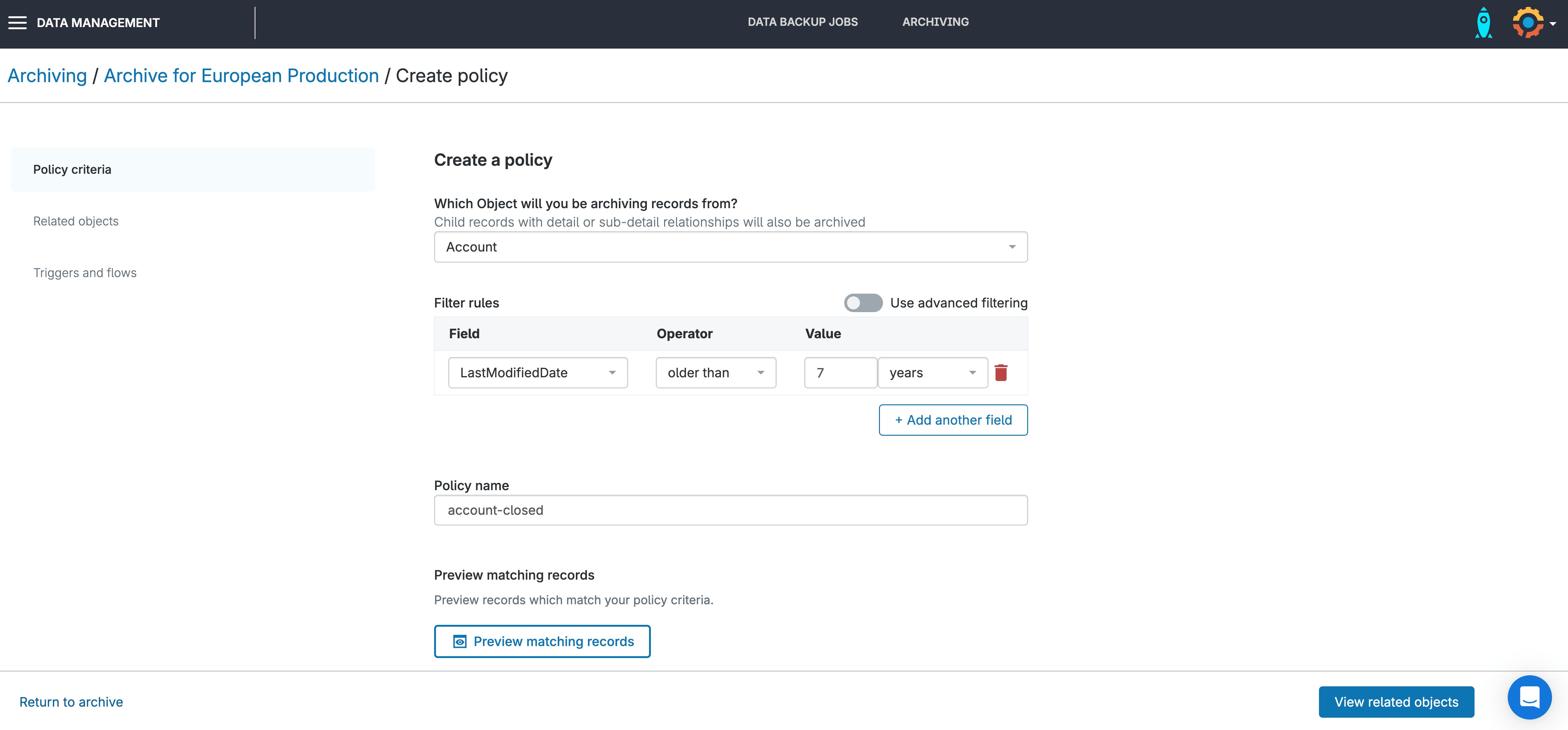 Retention policies are often needed to make sure your company’s archiving and backup practices comply with relevant data protection legislation like GDPR, CCPA, and industry-specific laws like the Health Insurance Portability and Accountability Act (HIPAA). These govern how long certain types of data must be retained and when they should be deleted. Work with your legal and compliance teams to ensure your policy aligns with these rules. Consider records like Cases, Opportunities, and field history tracking, which may have specific legal or operational retention requirements.
