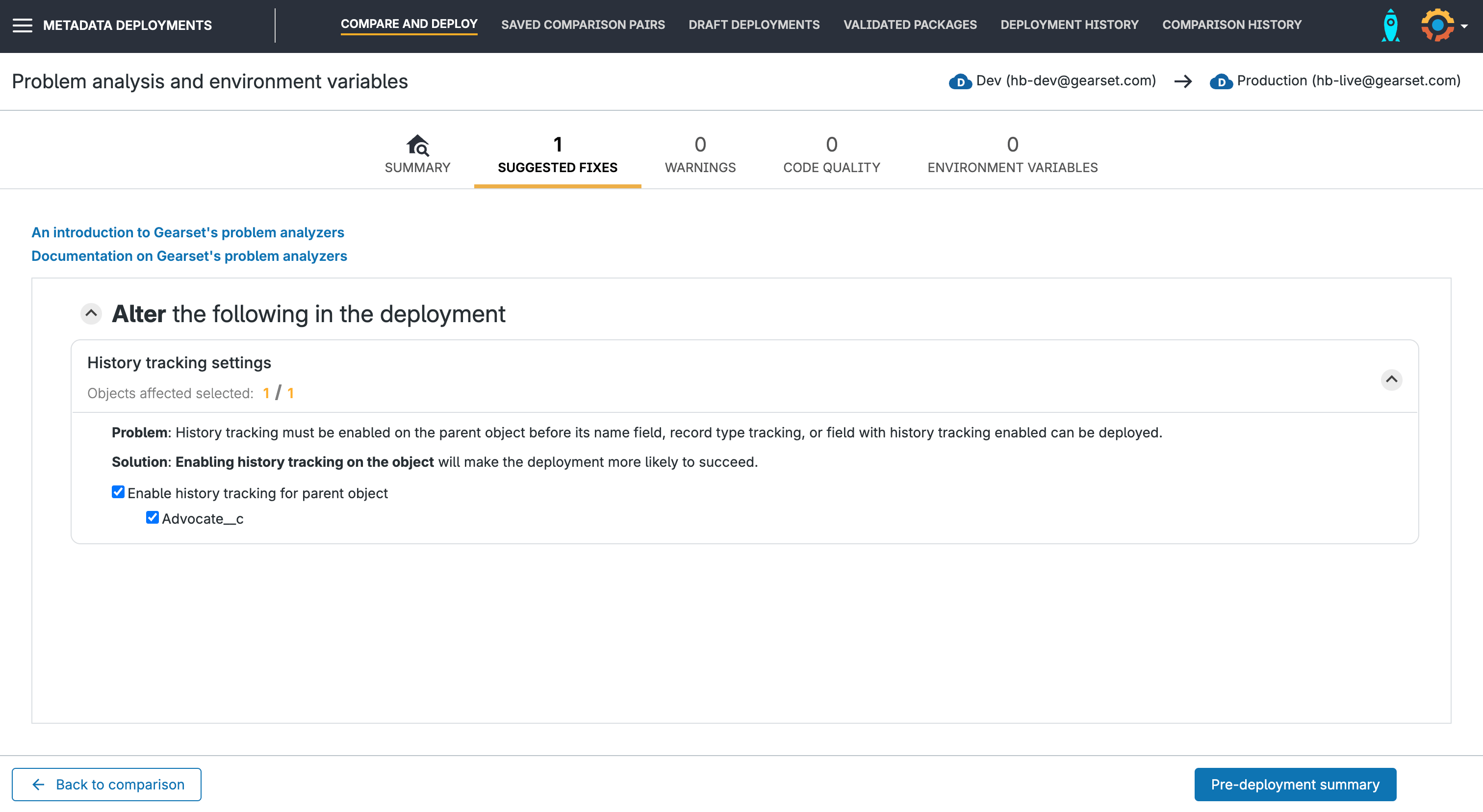 If history tracking isn’t enabled for the object in the target, Gearset will automatically suggest that you include the parent object as part of the deployment to enable history tracking. You can accept this suggestion with a single click without rebuilding the package.