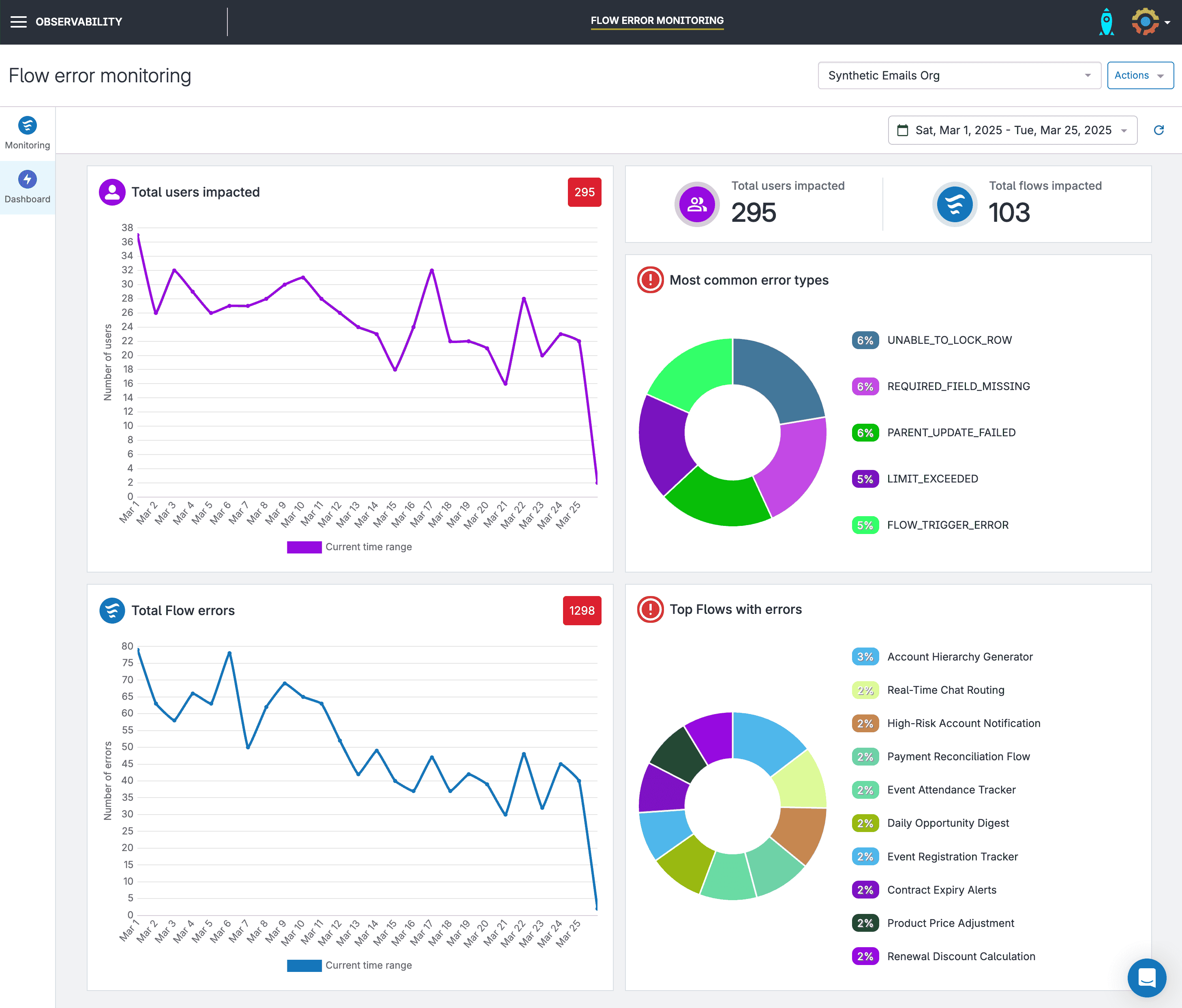 Flow and Apex error monitoring brings exceptions — the runtime issues that cause failures in your automations or code — out of inboxes and into shared dashboards. Rather than relying on scattered error emails, teams get a centralized view of faults with enough context to investigate and fix problems faster.