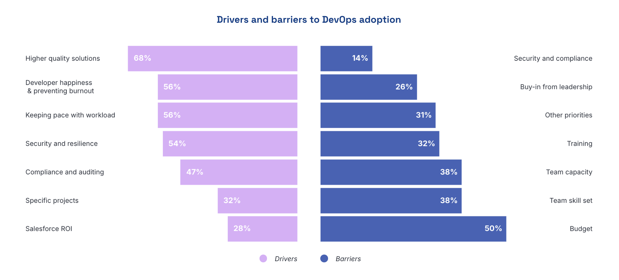 The drivers for Salesforce DevOps and the barriers faced by teams reflect the complexity of DevOps adoption. Budget constraints relate to tooling. Lack of buy-in, training or prioritization all highlight that a culture shift is needed. Security and compliance challenges should be addressed with tools, process and culture. For a successful DevOps implementation, you’ll need to consider all three.