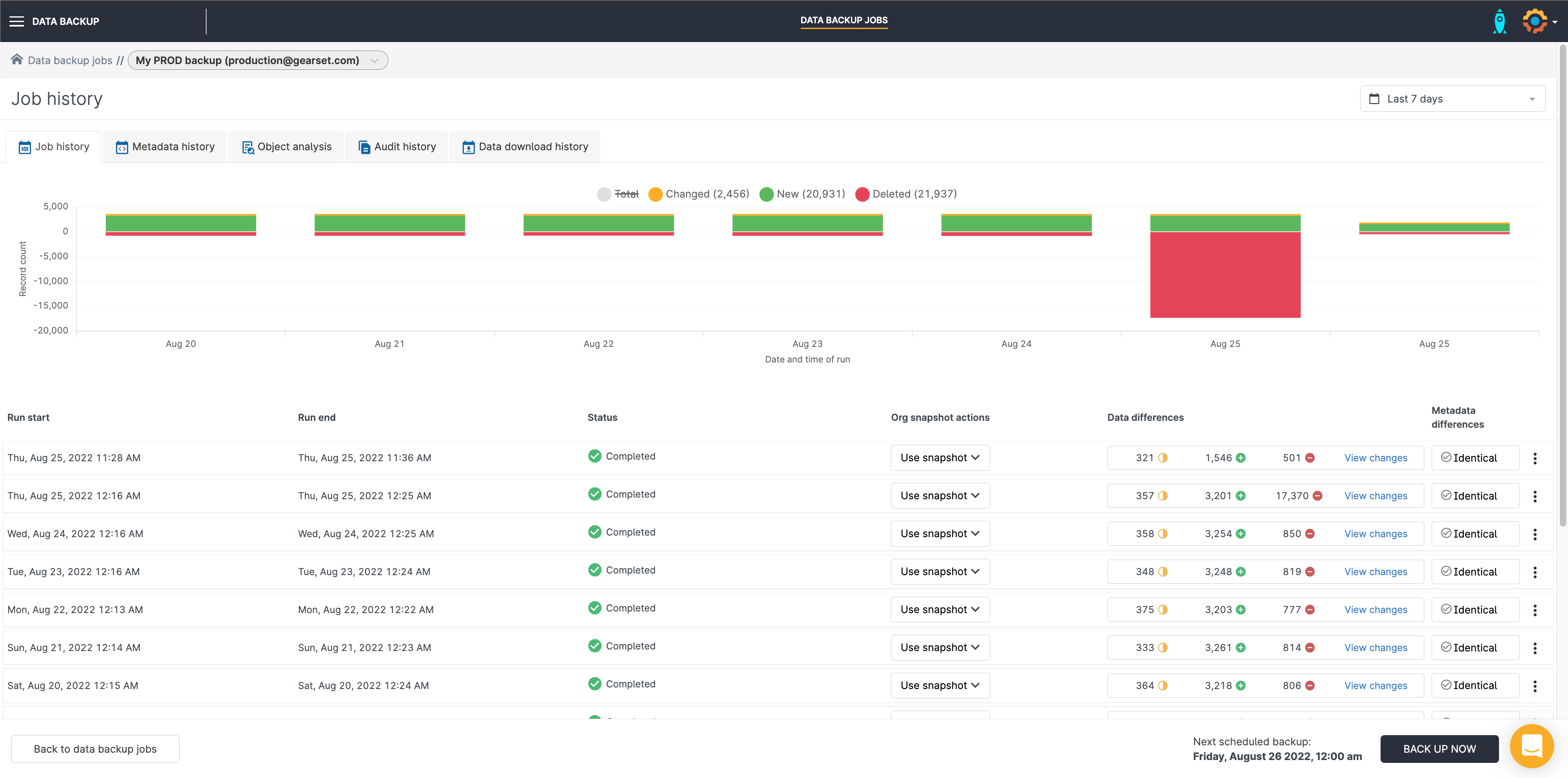Understanding your data is the first step to spotting data loss. It will allow you to recognise what’s normal for your backups, and what isn’t. Gearset visualizes your backups to show you the comparison between each backup run and the changing shape of your data over time.