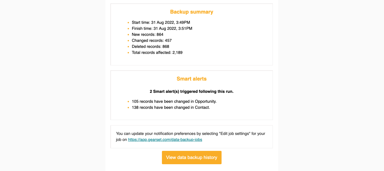 Embedded within these handy email updates are our smart alerts, which will notify you if an unexpected data change has occurred. These are completely customizable, as every Salesforce team’s data is different. A number of records changing between backups which may be shocking to a small organization could be the norm for a large global enterprise, so you’ll only be alerted if there’s data loss which is unexpected for you.