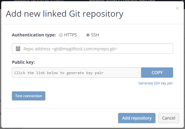If you are adding an SSH custom git repository for the first time, a key pair will not yet have been generated for you. If this is the case, click the Generate SSH key pair link below the Public key field.