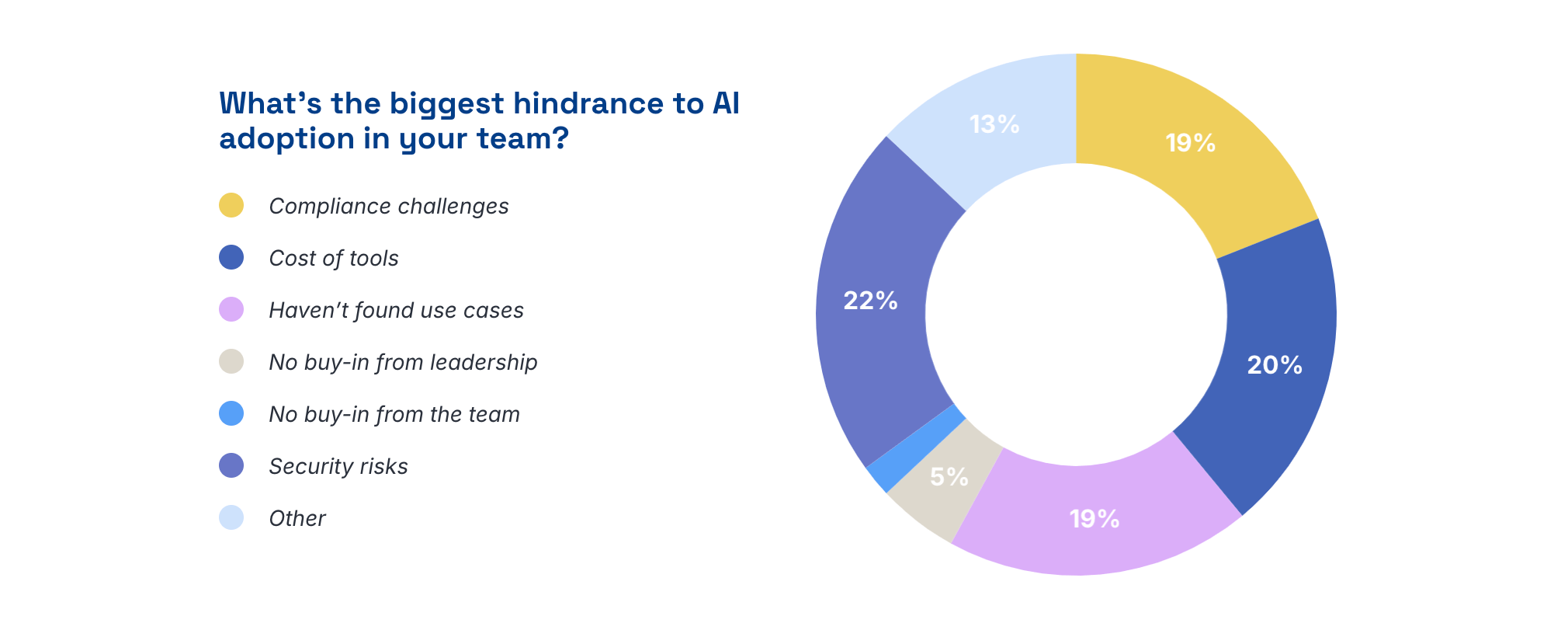 While individuals, teams and businesses are adopting AI at pace, there are still hurdles to overcome. Security, compliance, and cost are three major barriers. But just as often, the real barrier is that teams simply don’t have a clear use case. For almost one fifth of respondents, the biggest blocker for AI adoption is that it’s a solution in search of a problem — a powerful tool that doesn’t immediately resolve the pressing challenges they face.
