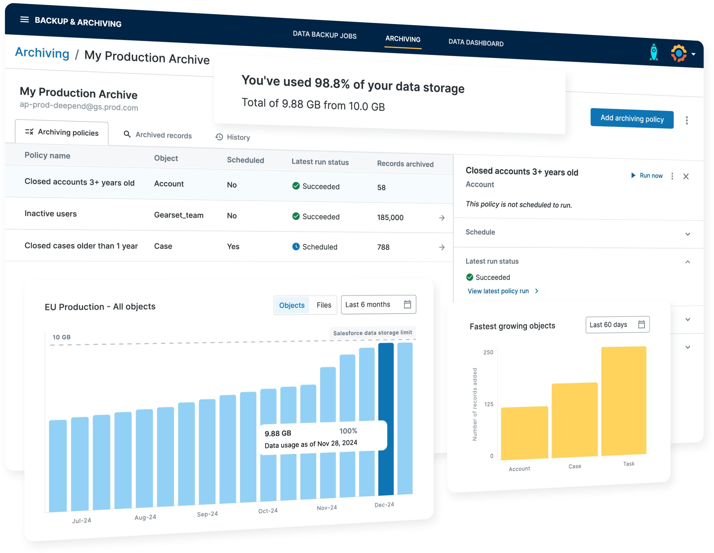 Gearset’s Salesforce backup solution is there to protect you in the event of data or metadata loss. Our Salesforce data archiving solution is about removing data from production to free up storage space and avoid performance degradation. This means archiving is used for smaller sub-sections of data. Like backup data, you can always restore archived Salesforce data to production.