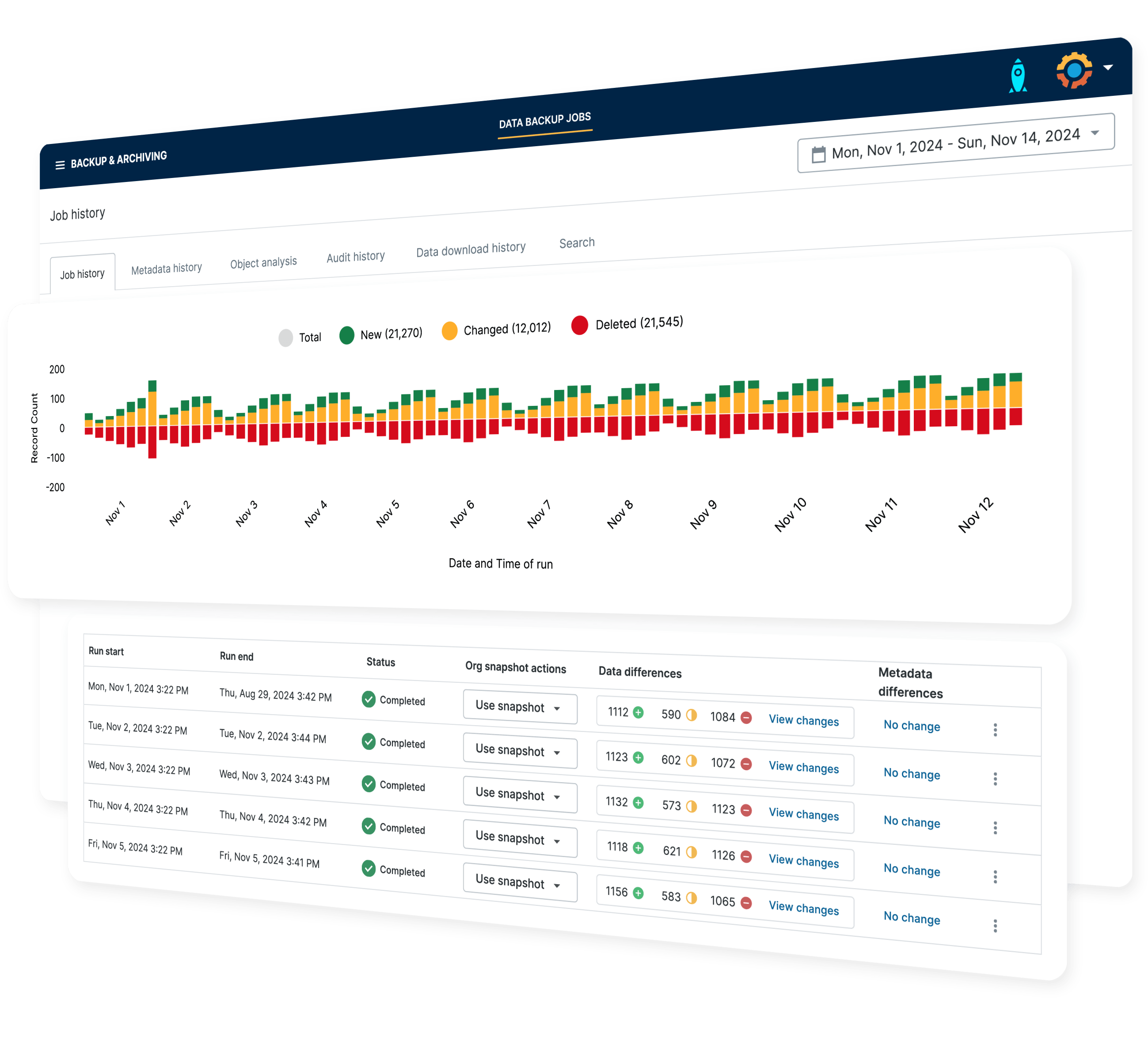 Run automated daily backups of your whole org and hourly high-frequency backups of your most critical objects. And back up on-demand whenever you need to.