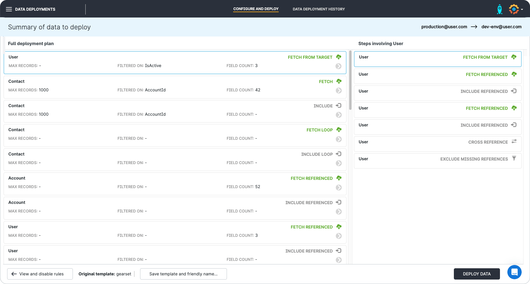 For rigorous testing and debugging, seed sandboxes with production data using Gearset’s smart data deployment solution — no need to export and import data in CSV files. Mask sensitive data to ensure compliance and deploy complex record hierarchies in moments.